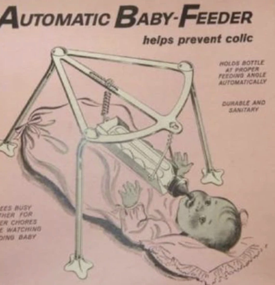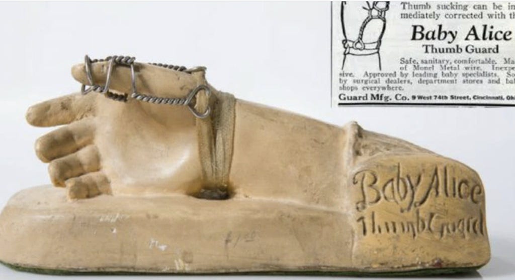 Imagine locking your kids thumb up in a cage of wire so that they don’t suck on it? Jesus Christ. This thing looks like a medieval torture device. And now knowing first hand what kids do, I can assure you that thousands of kids had tetanus by the age of three because even barbed wire won’t stop them from doing what they want.